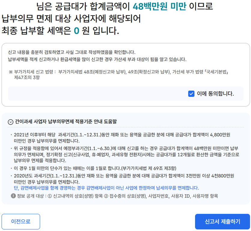 10. 최종 납부할 세액을 확인하여 동의하고, 신고서 제출하기를 클릭합니다.