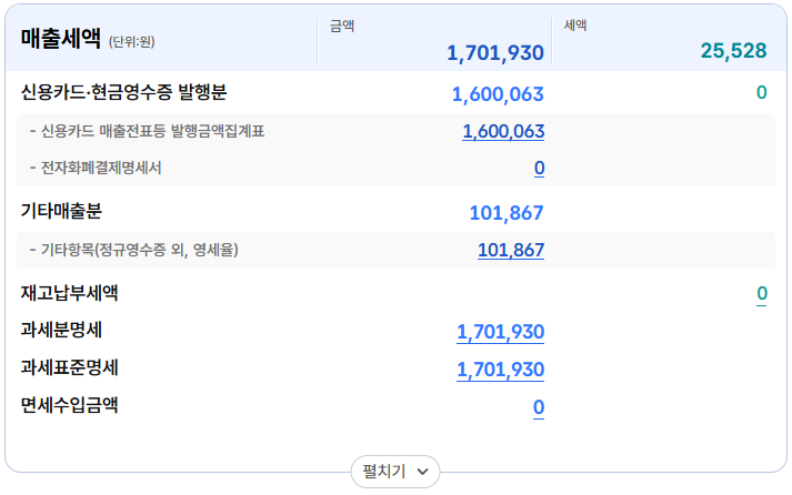 - 위에서 작성한 매출금액의 합계 1,701,930원(신용카드/현금영수증 매출+기타매출)와 일치한 금액으로 입력